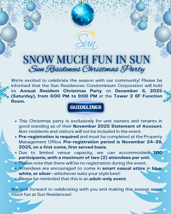 We are happy to announce that the Sun Residences Condominium Corporation will hold this year’s Christmas Bazaar from November 14 to November 28, 2025 from 9:00 AM to 8:00 PM at our 6th Floor Connecting Lobby.