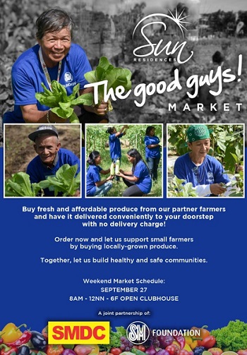 In line with the current situation we are all facing due to the pandemic wherein one of the most affected is the agricultural industry, Sun Residences Condominium Corporation, in partnership with the SMDC and SM Foundation will be having a Weekend Market in Clubhouse at 6th floor, Tower 1. Fresh and affordable produce will be available on September 27, 2020 from 8:00 AM to 12:00 PM.